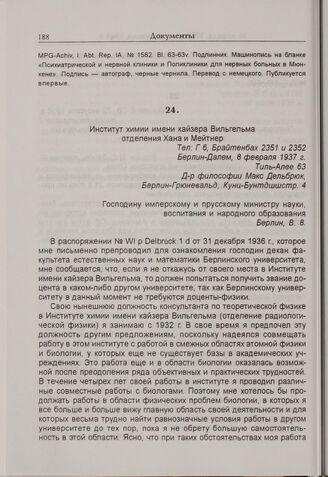 М. Дельбрюк — Б. Русту. 8 февраля 1937 г. // MPG-Archiv. I. Abt. Rep. 1А. № 189. Bl. 10-11. Подлинник. Машинопись на бланке.