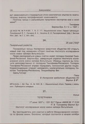 Ф. Глюм — в Имперское кредитное общество. 25 мая 1937 г. // MPG-Archiv. I. Abt. Rep, 1А. № 1620. Bl. 1. Машинописный отпуск.