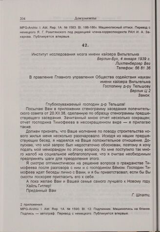 Г. Шпатц — Э. Тельшову. 4 января 1939 г. // MPG-Archiv. I. Abt Rep. 1А. № 1590. Bl. 12. Подлинник. Машинопись на бланке.