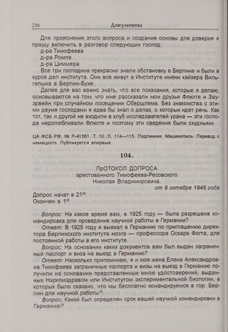 Протокол допроса Н.В. Тимофеева-Ресовского. 9 октября 1945 г.