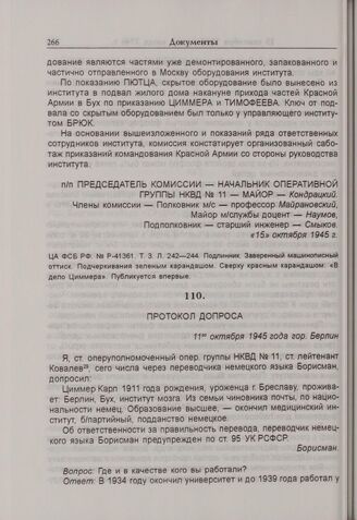 Протокол допроса К. Циммера. 11 октября 1945 г. // ЦА ФСБ РФ. № Р-41361. Т. 3. Л. 248-249об. Автограф.