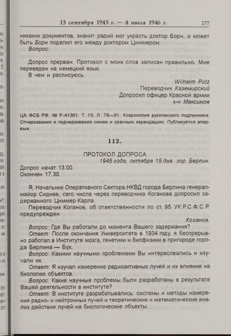 Протокол допроса К. Циммера. г. Берлин. 15 октября 1945 г. // ЦА ФСБ РФ. № Р-41361. Т. 3. Л. 252-262. Автограф.
