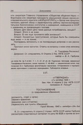 Постановление о предъявлении обвинения Н. В Тимофееву-Ресовскому. 24 октября 1945 г.
