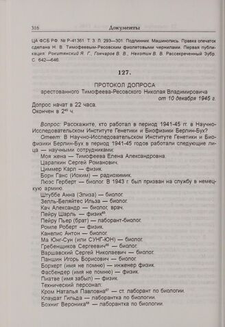 Протокол допроса Н.В. Тимофеева-Ресовского. 10 декабря 1945 г. // ЦА ФСБ РФ. № Р-41361. Т. 1. Л. 59-61об. — подлинник, Л. 57-59об. — машинописная копия.