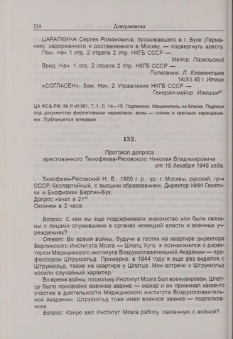 Протокол допроса Н.В. Тимофеева-Ресовского. 15 декабря 1945 г. // ЦА ФСБ РФ. № Р-41361. Т. 1. Л. 66-70об. — рукописный подлинник; Л. 61-64об. — машинописная копия.