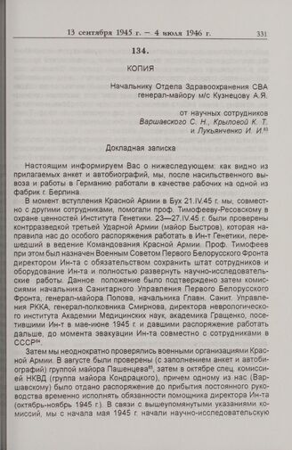 С.Н. Варшавский, К.Т. Крылова, И.И. Лукьянченко. Докладная записка. 7 января 1946 г.