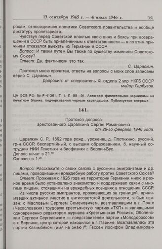 Главная Рассекреченный зубр. Следственное дело Н.В. Тимофеева-Ресовского Протокол допроса арестованного Царапкина Сергея Романовича от 26-го...