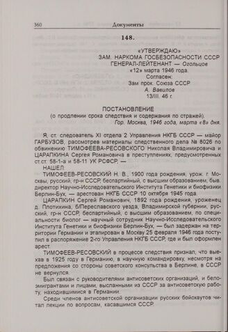 Постановление о продлении срока следствия и содержания под стражей Н.В. Тимофеева-Ресовского и С.Р. Царапкина. 8 марта 1946 г. // ЦА ФСБ РФ. № Р-41381. Т. 1. Л. 109-111. Подлинник. Машинопись.