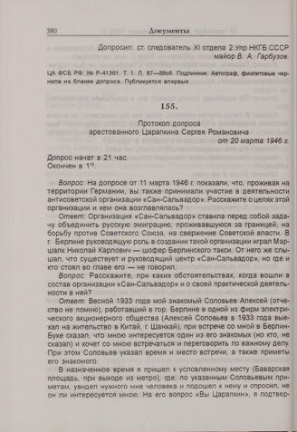 Протокол допроса арестованного Царапкина Сергея Романовича от 20 марта 1946 г. // ЦА ФСБ РФ. № Р-41361. Т. 1. Л. 128-133 — рукописный подлинник, Л. 124-127— машинопись.