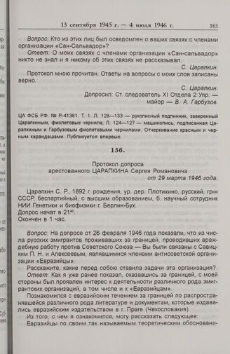 Протокол допроса арестованного Царапкина Сергея Романовича от 29 марта 1946 г. // ЦА ФСБ РФ. № Р-41361. T. 1. Л. 140-143об. — автограф, Л. 134-139 — машинопись.