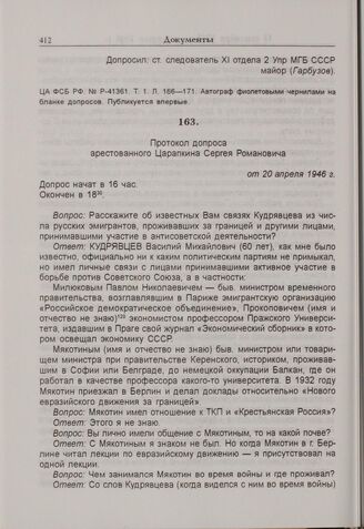 Протокол допроса арестованного Царапкина Сергея Романовича от 20 апреля 1946 г. // ЦА ФСБ РФ. № Р-41361. Т. 1. Л. 174-175об. — автограф, Л. 172-173 — машинопись.