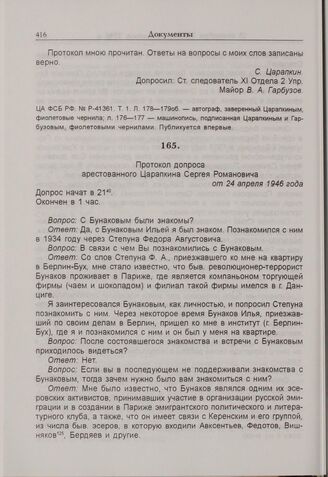 Протокол допроса арестованного Царапкина Сергея Романовича от 24 апреля 1946 г. // ЦА ФСБ РФ. № Р-41361. Т. 1. Л. 187-191об. — автограф, Л. 180-186 — машинопись.