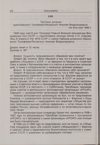 Протокол допроса арестованного Тимофеева-Ресовского Николая Владимировича от 6 мая 1946 г. // ЦА ФСБ РФ. № Р-41361. Т. 1. Л. 212-214 — автограф, Л. 208-211 — машинопись.