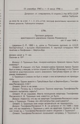 Протокол допроса арестованного Царапкина Сергея Романовича от 11 мая 1946 г. // ЦА ФСБ РФ. № Р-41361. Т. 1. Л. 222-226об. — автограф, Л. 222-227 — машинопись.
