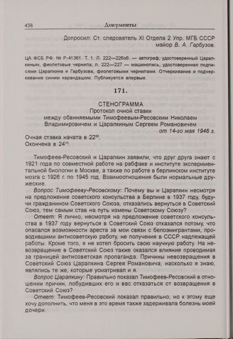 Протокол очной ставки между обвиняемыми Тимофеевым-Ресовским Николаем Владимировичем и Царапкиным Сергеем Романовичем от 14 мая 1946 г.