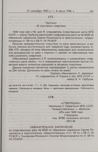 Протокол об окончании следствия по делу С.Р. Царапкина. 18 мая 1946 г. // ЦА ФСБ РФ. № Р-41361. Т. 1. Л. 285. Подлинник. Автограф на бланке.