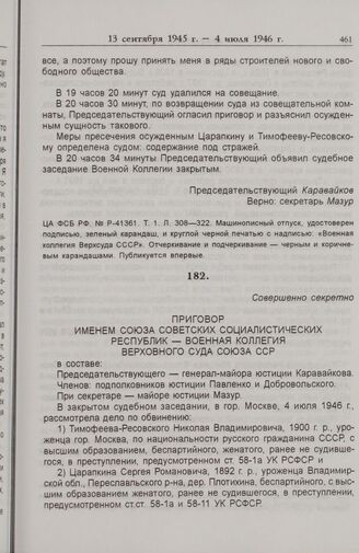 Приговор Военной коллегии Верховного Суда СССР. 4 июля 1946 г. // ЦА ФСБ РФ. № Р-41361. Т 1. Л. 323-324. Машинописный отпуск.