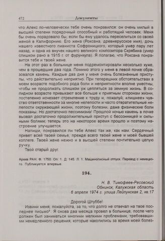 Н.В. Тимофеев-Ресовский — Г. Штуббе. Обнинск, Калужская область. 6 апреля 1974 г. // Архив РАН. Ф. 1750. Оп. 1. Д. 170. Л. 2-3. Машинописный отпуск.