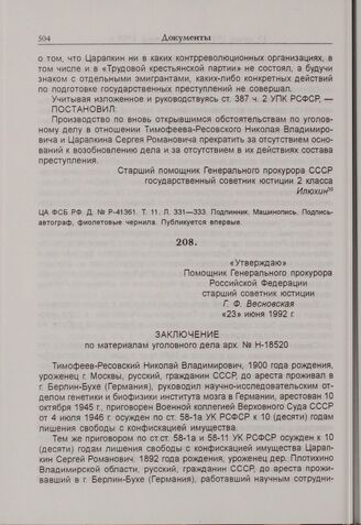 Заключение по материалам уголовного дела № Н-18920. 23 июня 1992 г. // ЦА ФСБ России. № Р-41361. Т. 11. Л. 334-337. Подлинник. Машинопись.
