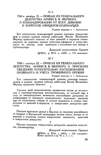 Приказ из генерального дежурства армии В.В. Фермора о присылке сведений относительно расходования провианта и учета трофейного оружия. г. Аренсвальд. 1760 г. октября 22
