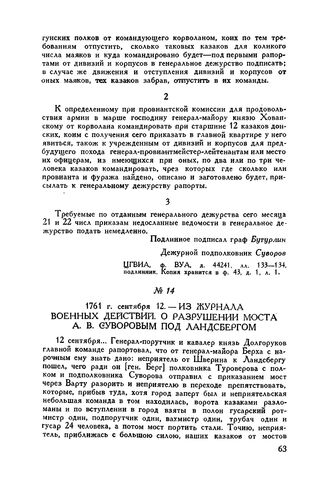 Из журнала военных действий. О разрушении моста А.В. Суворовым под Ландсбергом. 1761 г. сентября 12 // ЦГВИА, ф. ВУА, д. 1681, стр. 416-417, подлинник.