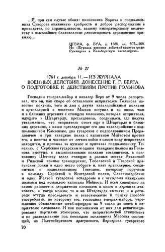 Из журнала военных действий. Донесение Г.Г. Берга о подготовке к действиям против Гольнова. 1761 г. декабря 11 // ЦГВИА, ф. ВУА, д. 1688, лл. 214 об.-215, подлинник.
