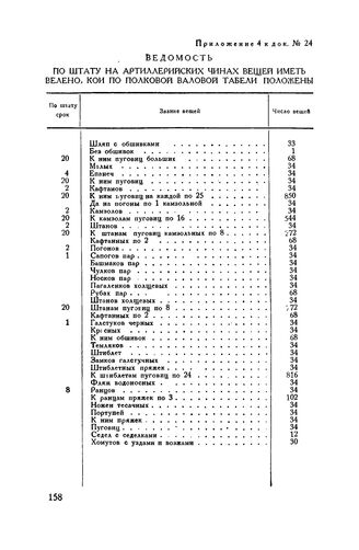 Приложение 4 к Полковому учреждению. Ведомость по штату на артиллерийских чинах вещей иметь велено, кои по полковой валовой табели положены