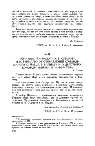 Рапорт А.В. Суворова И.И. Веймарну об отправлении команды майора С. Плеца в Варшаву и о действиях команды майора И.И. Ферстера. м. Пулава. 1770 г. марта 19