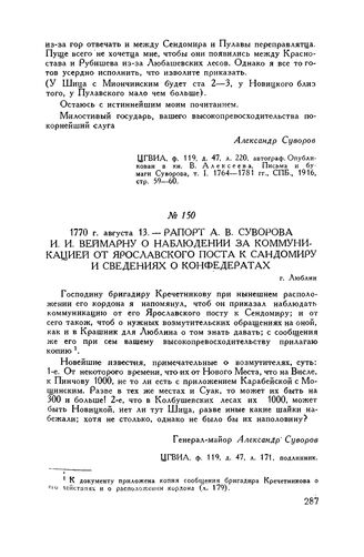 Рапорт А.В. Суворова И.И. Веймарну о наблюдении за коммуникацией от Ярославского поста к Сандомиру и сведениях о конфедератах. г. Люблин. 1770 г. августа 13 // ЦГВИА, ф. 119, д. 47, л. 171, подлинник.