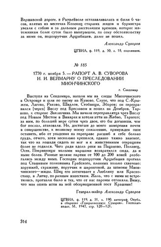 Рапорт А.В. Суворова И.И. Веймарну о преследовании Миончинского. г. Сандомир. 1770 г. ноября 5 // ЦГВИА, ф. 119, д. 51, л. 190, автограф. Опубл. в сборнике «Генералиссимус Суворов». Госполитиздат, М., 1947, стр. 120-121.