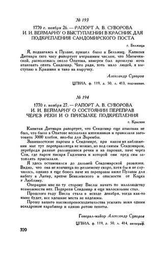 Рапорт А.В. Суворова И.И. Веймарну о состоянии переправ через реки и о присылке подкрепления. г. Красник. 1770 г. ноября 27 // ЦГВИА, ф. 119, д. 50, л. 414, автограф.