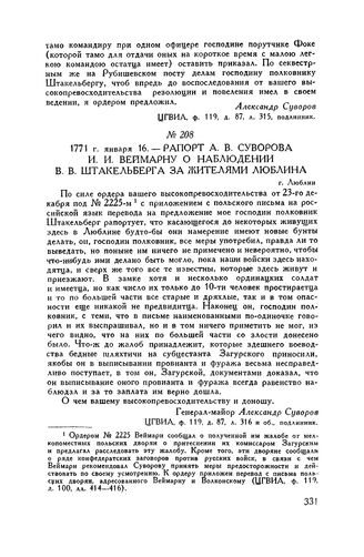 Рапорт А.В. Суворова И.И. Веймарну о наблюдении В.В. Штакельберга за жителями Люблина. г. Люблин. 1771 г. января 16 // ЦГВИА, ф. 119, д. 87, л. 316 и об., подлинник.
