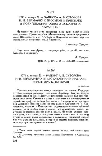 Записка А.В. Суворова И.И. Веймарну с просьбой о присылке в подкрепление одного эскадрона карабинер. 1771 г. января 22 // ЦГВИА, ф. 119, д. 87, лл. 453-455, дешифровка.
