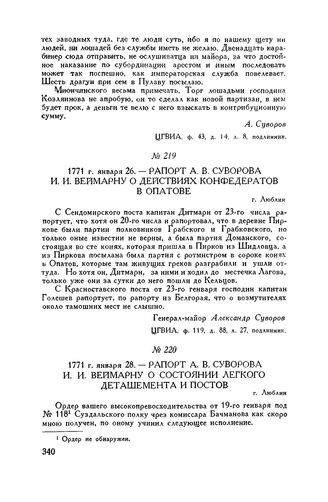 Рапорт А.В. Суворова И.И. Веймарну о состоянии легкого деташемента и постов. г. Люблин. 1771 г. января 28 // ЦГВИА, ф 119, д. 88, лл. 21-22, подлинник.