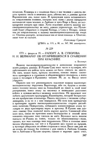 Рапорт А.В. Суворова И.И. Веймарну об отличившихся в сражении при Краснике. м. Белжицы. 1771 г. февраля 19 // ЦГВИА, ф. 119, д. 88, л. 370, автограф.