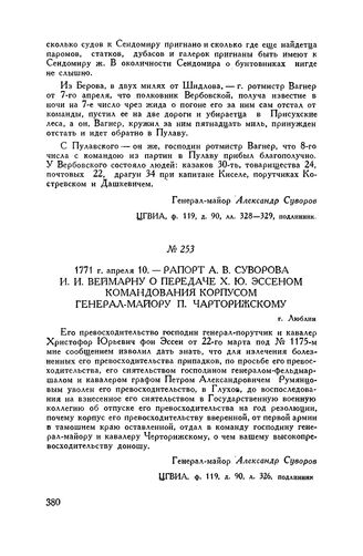 Рапорт А.В. Суворова И.И. Веймарну о передаче X.Ю. Эссеном командования корпусом генерал-майору П. Чарторижскому. г. Люблин. 1771 г. апреля 10 // ЦГВИА, ф. 119, д. 90, л. 326, подлинник.