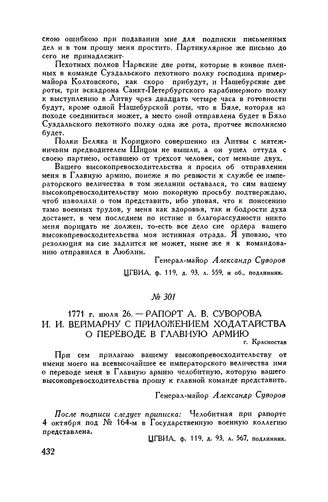 Рапорт А.В. Суворова И.И. Веймарну с приложением ходатайства о переводе в главную армию. г. Красностав. 1771 г. июля 26 // ЦГВИА, ф. 119, д. 93, л. 567, подлинник.