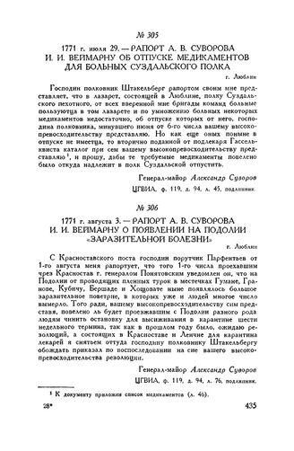 Рапорт А.В. Суворова И.И. Веймарну о появлении на Подолии «заразительной болезни». г. Люблин. 1771 г. августа 3 // ЦГВИА, ф. 119, д. 94, л. 76, подлинник.