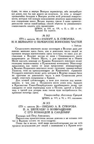 Рапорт А.В. Суворова И.И. Веймарну о переброске воинских частей. г. Люблин. 1771 г. августа 18 // ЦГВИА, ф. 119, д. 94, л. 411, подлинник.