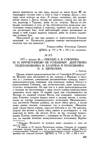 Письмо А.В. Суворова М.Н. Кречетникову об успешных действиях подполковника И. Елагина и полковника П.А. Шепелева. г. Люблин. 1771 г. августа 26 // ЦГВИА, ф. 119, св. 131, ч. I, лл. 18-19 об., черновик без подписи.
