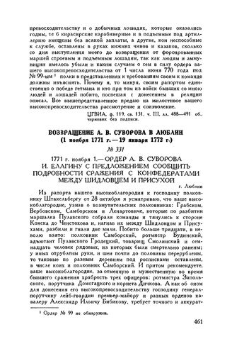 Ордер А.В. Суворова И. Елагину с предложением сообщить подробности сражения с конфедератами между Шидловцем и Присухой. г. Люблин. 1771 г. ноября 1 // ЦГВИА, ф. 119, св. 131, ч. I, л. 79 и об., черновик без подписи.