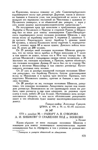 Рапорт А.В. Суворова А.И. Бибикову о сражении под д. Бонково. м. Пулавы. 1771 г. декабря 30 // ЦГВИА, ф. 104, д. 50, л. 37 и об., подлинник.