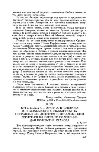 Ордер А.В. Суворова И.И. Михельсону с указанием на неправильные действия и предложением вернуться на прежнее положение для прикрытия Кракова. г. Краков. 1772 г. февраля 4 // ЦГВИА, ф. 104, д. 50, л. 630-631 и об., копия.