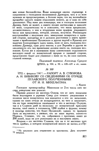 Рапорт А.В. Суворова А.И. Бибикову со сведениями об отряде Пулавского, полученными от И.И. Михельсона. г. Краков. 1772 г. февраля [14] // ЦГВИА, ф. 104, д. 50, лл. 692-693, подлинник.