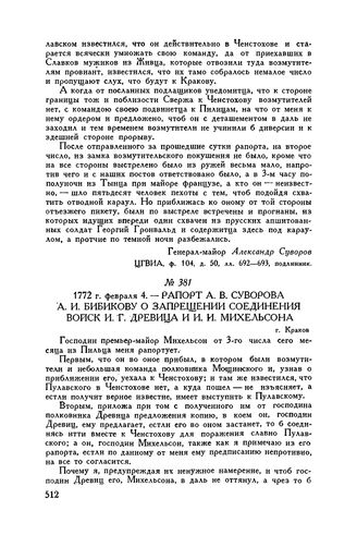 Рапорт А.В. Суворова А.И. Бибикову о запрещении соединения войск И.Г. Древица и И.И. Михельсона. г. Краков. 1772 г. февраля 4 // ЦГВИА, ф. 104, д. 50, лл. 700-701, подлинник.