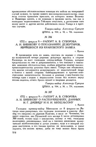Рапорт А.В. Суворова А.И. Бибикову о показаниях дезертиров, явившихся из Краковского замка. г. Краков. 1772 г. февраля 9