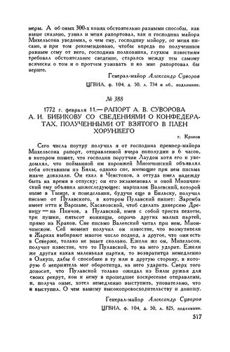 Рапорт А.В. Суворова А.И. Бибикову со сведениями о конфедератах, полученными от взятого в плен хорунжего. г. Краков. 1772 г. февраля 11 // ЦГВИА, ф. 104, д. 50, л. 825, подлинник.