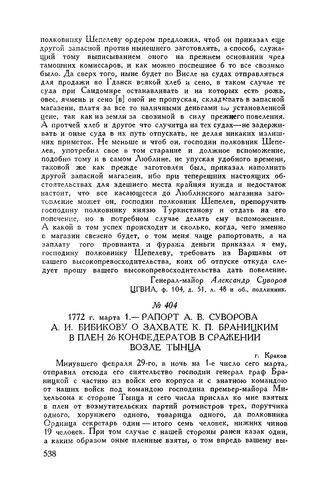 Рапорт А.В. Суворова А.И. Бибикову о захвате К.П. Браницким в плен 26 конфедератов в сражении возле Тынца. г. Краков. 1772 г. марта 1 // ЦГВИА, ф. 104, д. 51, л. 48 и об., подлинник.