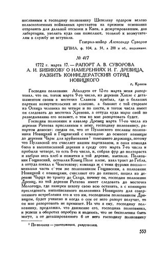 Рапорт А.В. Суворова А.И. Бибикову о намерениях И.Г. Древица разбить конфедератский отряд Новицкого. г. Краков. 1772 г. марта 17