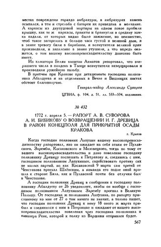 Рапорт А.В. Суворова А.И. Бибикову о возвращении И.Г. Древица в район Конецполя для прикрытия осады Кракова. г. Краков. 1772 г. апреля 5 // ЦГВИА, ф. 104, д. 51, лл. 537, 541, подлинник.